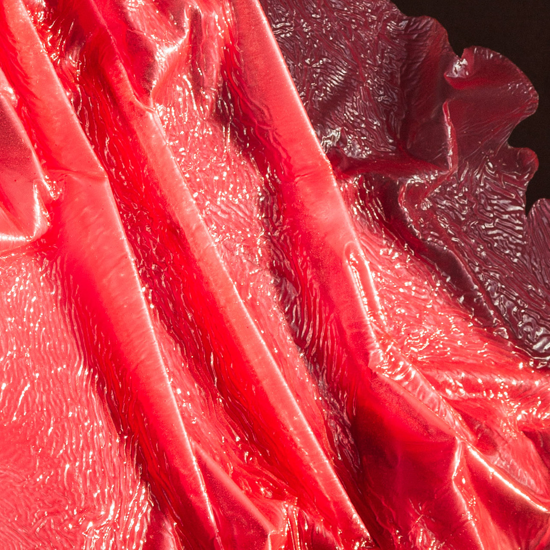 Part of a series of artworks in semi-transparent colored resin that the artist creates by molding, shaping, and bending the material using chemicals she has composed through trial and error. The sculptures, glossy and colorful, incredibly resembling giant sugar glass or pre-chewed gum, seduce the viewer and create uncertainty about their nature. They appear organic but at the same time clearly inorganic, generating curiosity about the material and inviting touch.